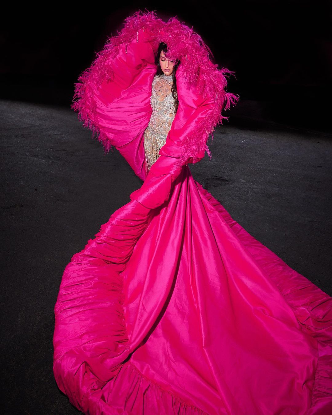 नोरा ने गाउन के साथ पिंक कलर का लॉन्ग सैटिन फ्रिल श्रग पहना।